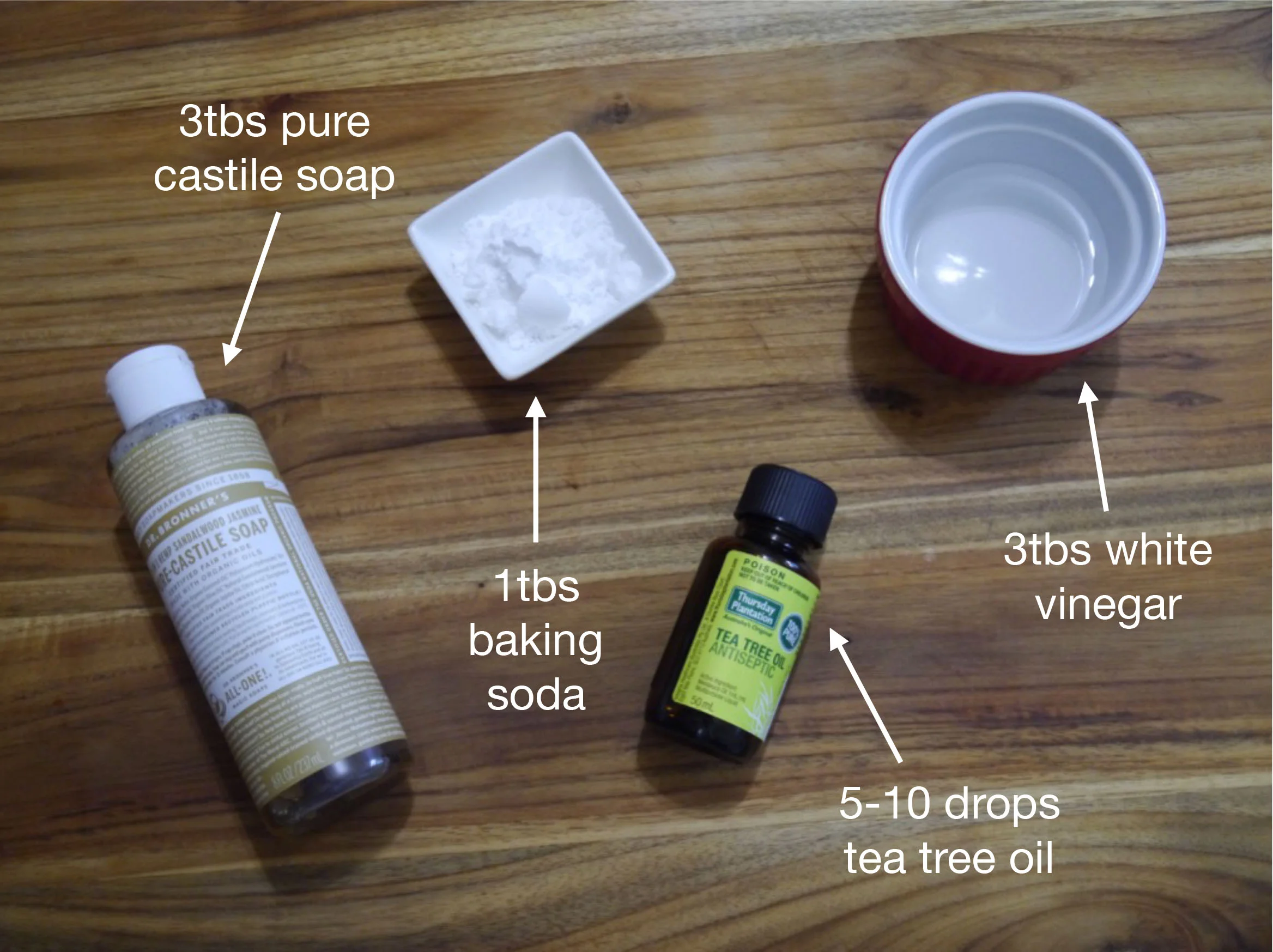 - 3 tbs Castile soup (Dr Bronner's brand is great, and any scent will work fine - pick your favourite!)